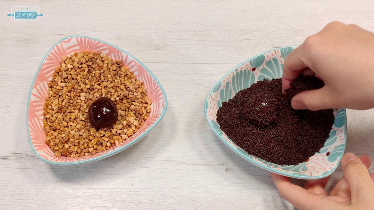 Después las vamos pasando por el granillo de almendra y los fideos de chocolate