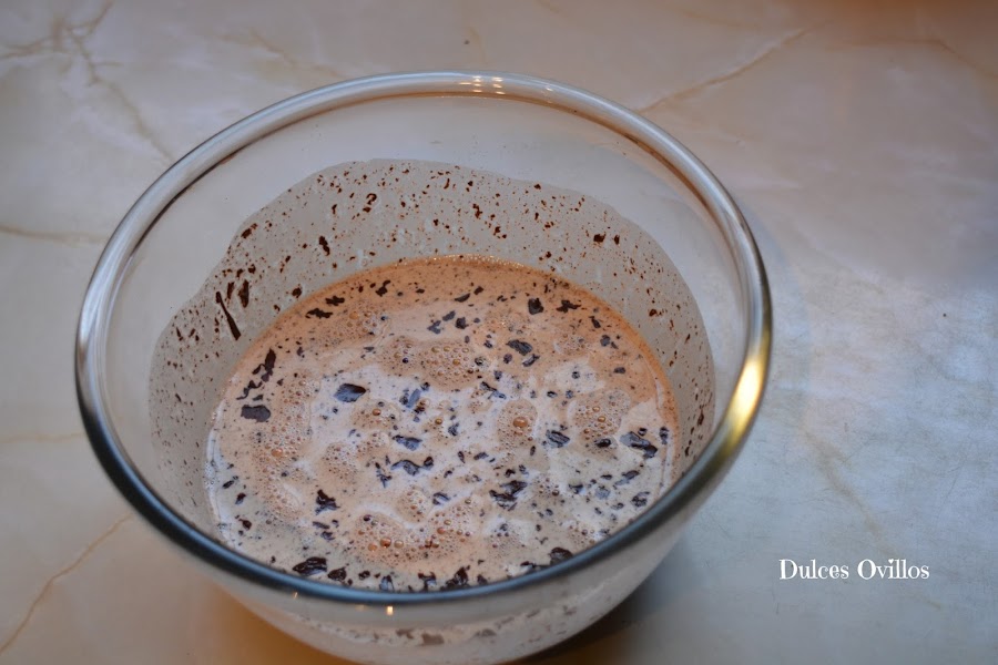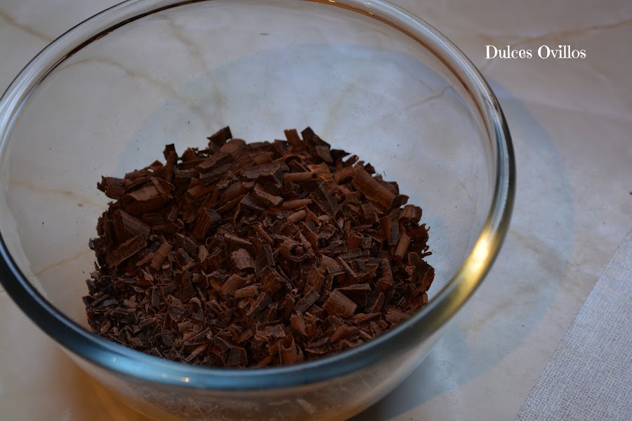 - Calentar la nata (crema de leche) y cuando esté a punto de hervir verterla sobre el chocolate cuidando que quede todo cubierto.