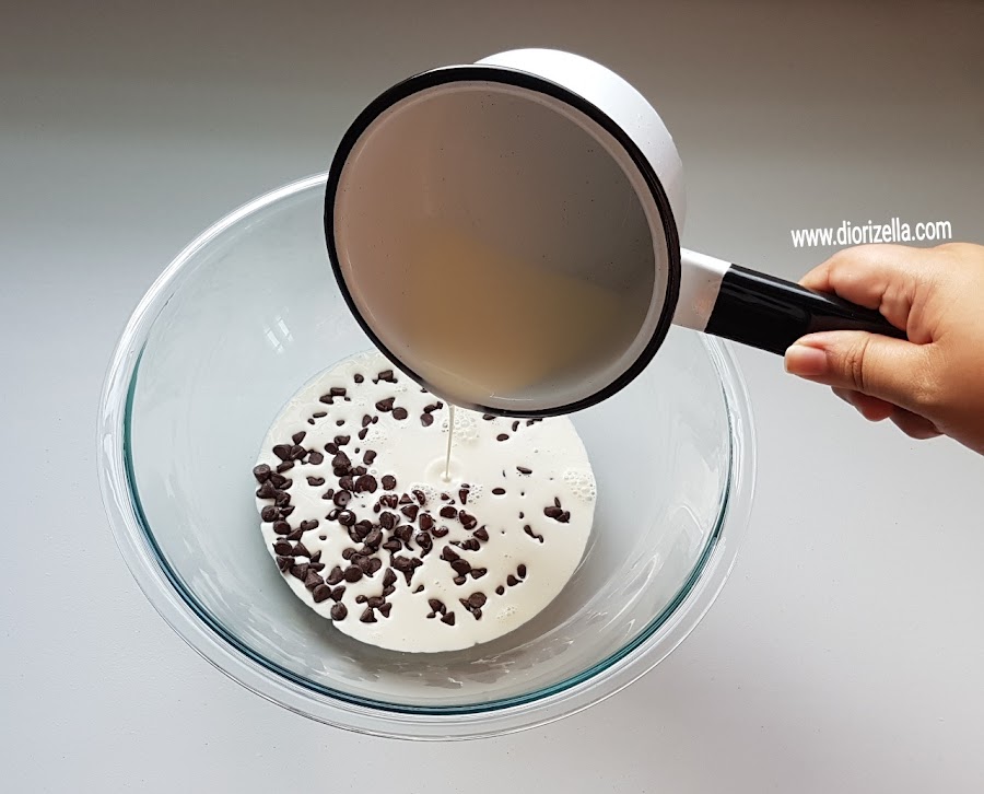 2. Verter la crema tibia sobre las chispas de chocolate.