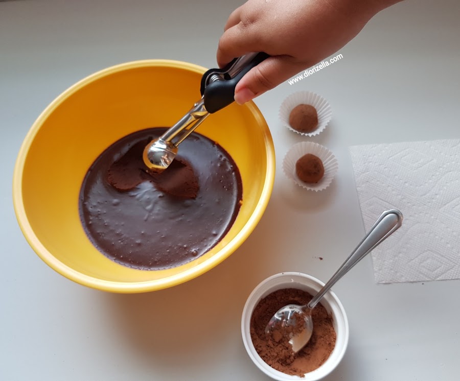 6. Toma una pequeña porción con una cuchara y déjala caer en el cacao en polvo.