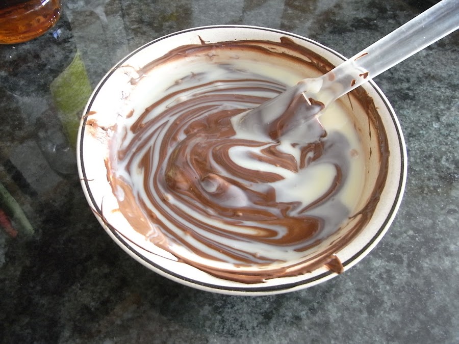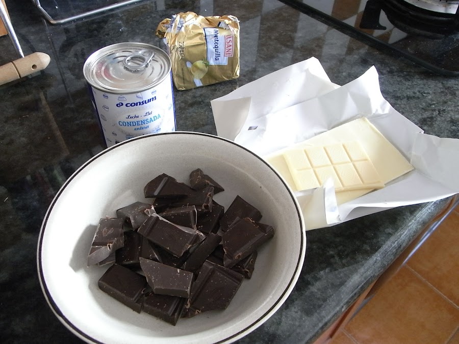 Se funde en el microondas el chocolate negro a golpes de 30 segundos para que no se queme y cuando esté a medio fundir se añade el chocolate blanco se le dan 30 segundos más y se remueve hasta que se integre todo y no queden trocitos. Este paso se puede hacer al baño María pero yo prefiero el microondas porque es más rápido y mancho menos. Se añaden la leche condensada y el brandy y se remueve hasta integrarlos.