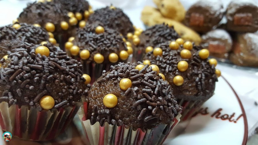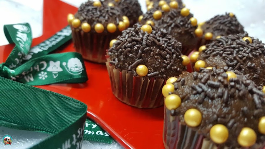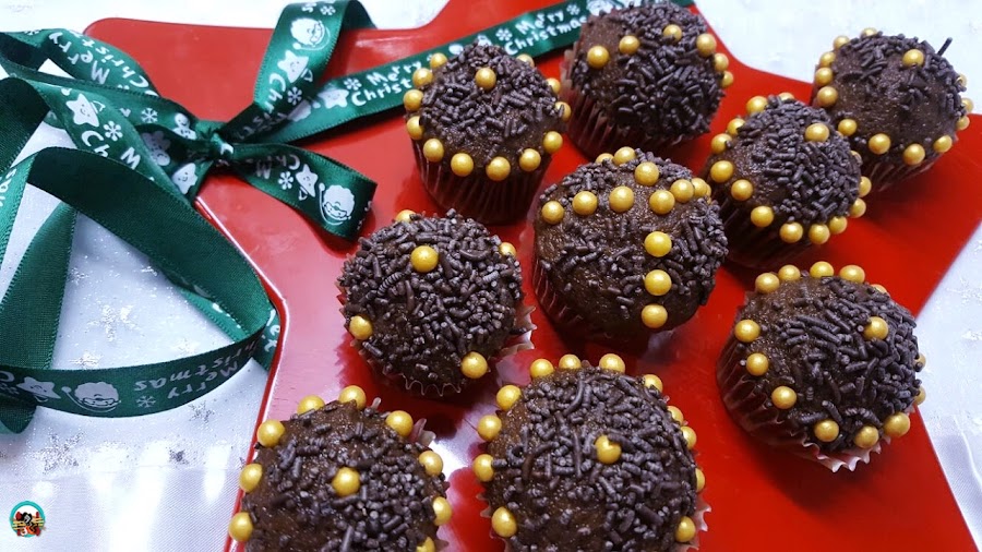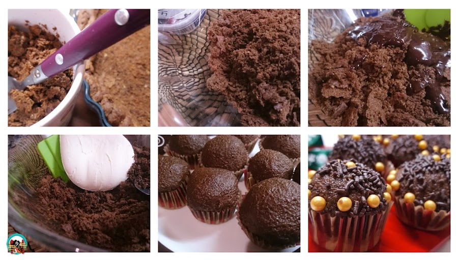 2.- Con la manos limpias, tomamos porciones de la masa. Le damos forma de bola o trufa. Las ponemos en pequeñas cápsulas de magdalenas. Las decoramos con las bolas de azúcar y los fideos de chocolate. Las guardamos en la nevera hasta el momento de servir.
