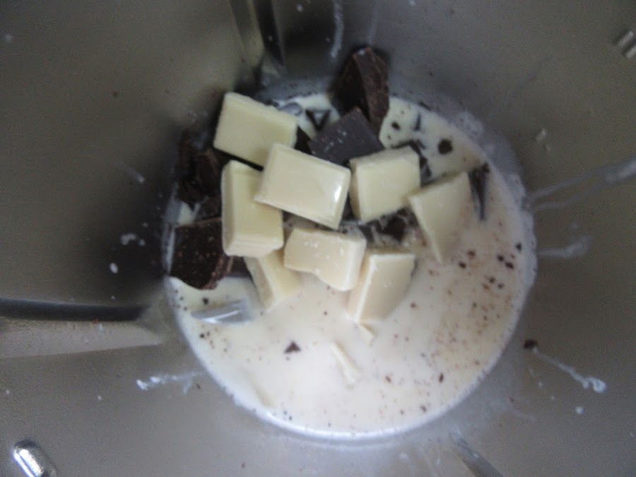 1- Calentar la nata (crema de leche) hasta que casi llegue a hervir. Añadir los chocolates troceados, y mezclar hasta que éstos se fundan.