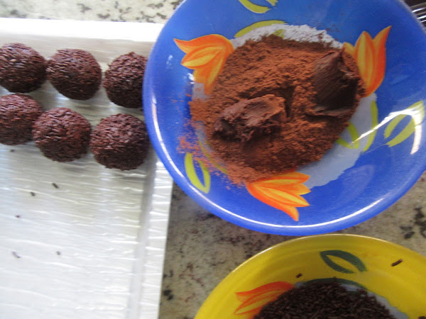 Y rebozamos en fideos de chocolate o cacao en polvo y vamos redondeando con las palmas de las manos.