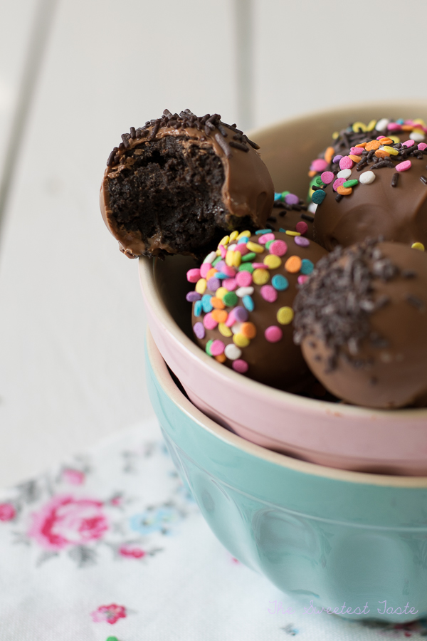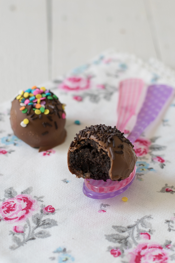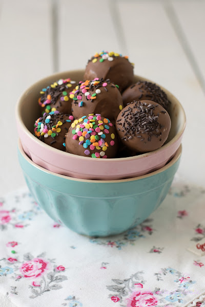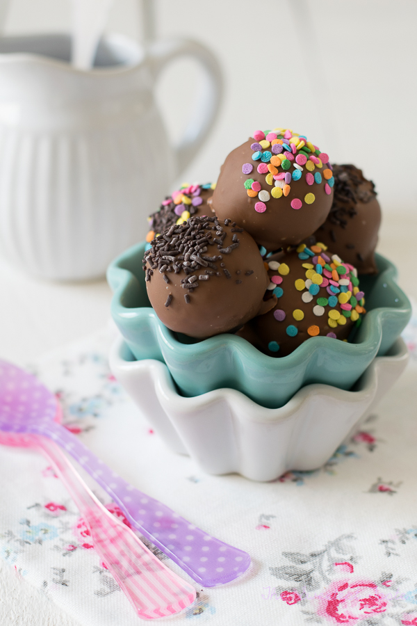 Bañamos las bolas. Nos ayudamos pinchándolas con un tenedor y las vamos dejando sobre una rejilla o sobre una bandeja. Decoramos con sprinkles, fideos de chocolate, chocolate blanco fundido, chocolate negro fundido...o las dejamos sin decorar.
