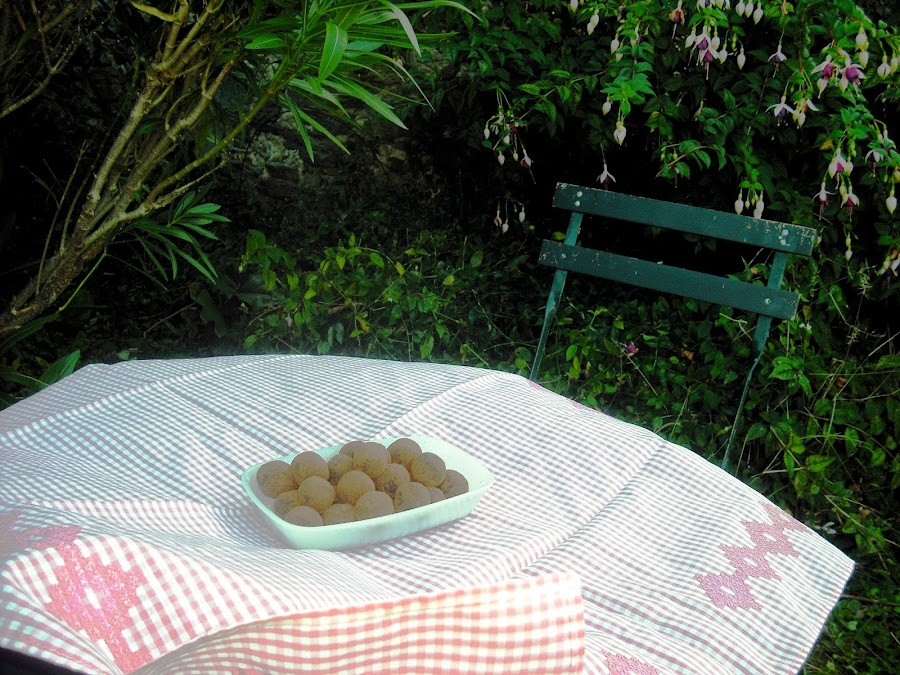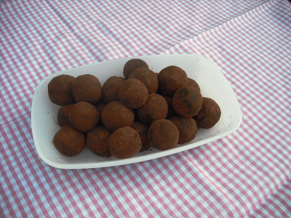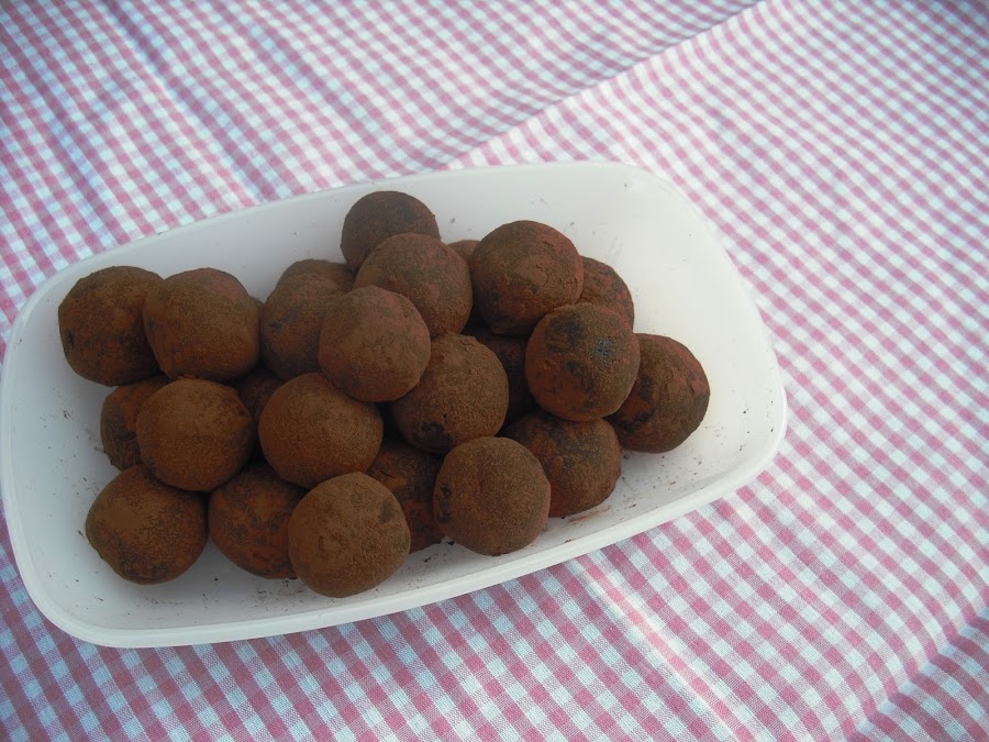 Al cabo de este tiempo sacar de la nevera, tomar pequeñas porciones y darles forma de bola, rebozar en el cacao y colocar en un molde de papel rizado (yo no tenía, así que las coloqué directamente en el plato).