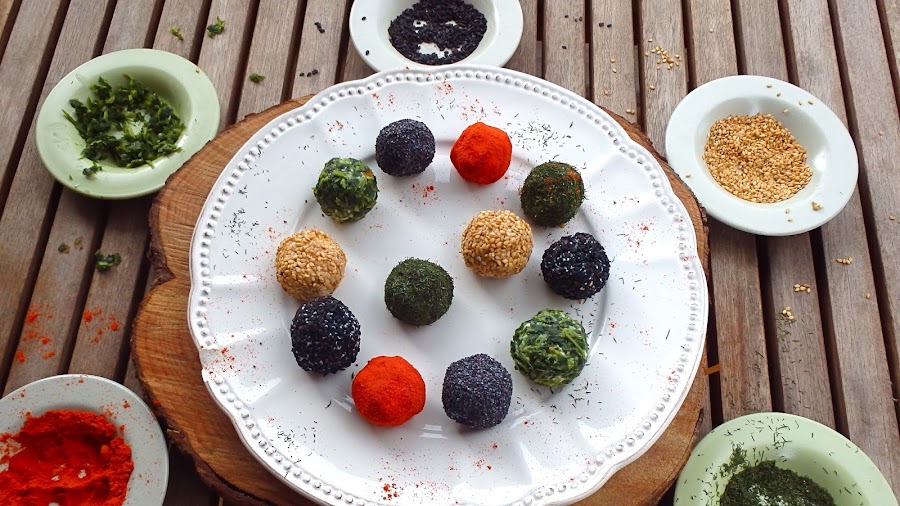 Disponemos en platitos los diferentes rebozados de nuestras trufas de queso de cabra y las vamos rebozando en ellos, de manera que queden totalmente cubiertas y no se vea el queso. Ya veras que es un proceso muy rápido.