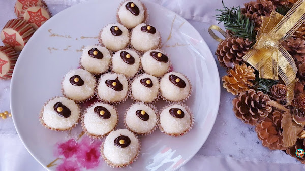 Consejo: Cuando vayas a comer las trufas de coco nevada, retírales primero la hoja aromática que le hemos puesto para decorarlas. En la cena de Noche Vieja o el Día de Navidad, las puedes poner sobre un plato formando un árbol de navidad. Así, también será un elemento más para decora la mesa en ese día tan especial.