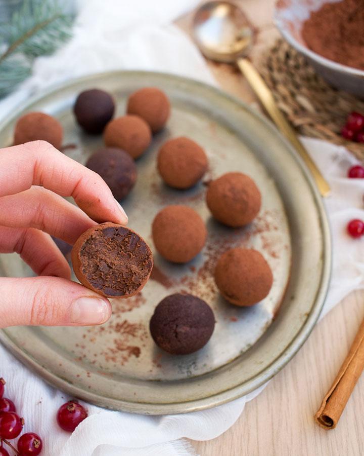 Después coge una cucharada de pasta para cada trufa y redondéalas con las manos. Pasa las trufas por el cacao en polvo. Colócalas sobre una bandeja o plato y sirve. Guarda las trufas en la nevera si no las vas a comer en el momento, aguantan varios días. Es mejor consumirlas a temperatura ambiente para disfrutar más de su sabor por lo que sácalas de frigorífico con 1h de antelación.