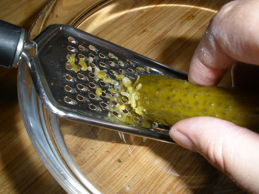 Lava bien los pepinillos en agua para quitarles los restos de vinagre y rállalos o pícalos lo más finamente posible (yo prefiero utilizar el rallador).