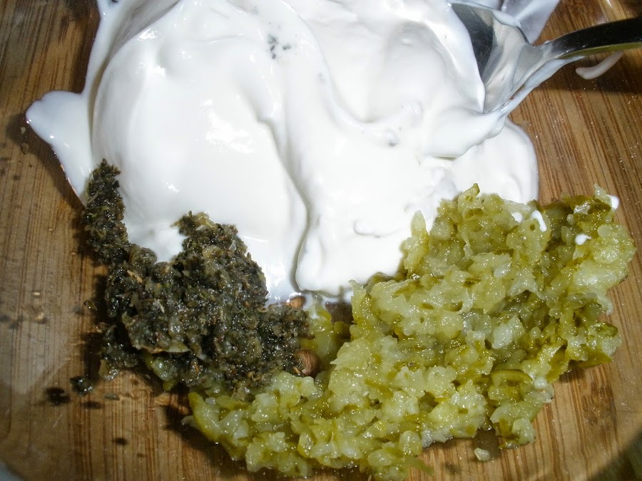 Mezcla en un bol el yogurt griego, el majado de ajo y hierbabuena y los pepinillos hasta que quede una salsa uniformemente mezclada. Añade media cucharadita de postre de aceite de oliva para mejorar la textura y ligar todo y remueve hasta que se integre.