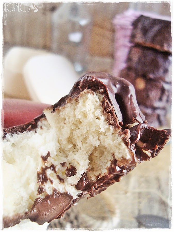 Una vez frío, montamos la nata (crema de leche) junto con azúcar glass y lo rellenamos con cuidado. Yo metí en el congelador por una hora para que la nata (crema de leche) estuviera congelada y a la hora de partir las rodajas y verter el chocolate caliente por encima aguantara sin desmoronarse.