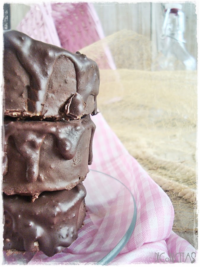 Para la cobertura de chocolate, derretimos el chocolate con la mantequilla y vertemos por encima de las rodajas encima de una rejilla para aprovechar el chocolate que sobra.
