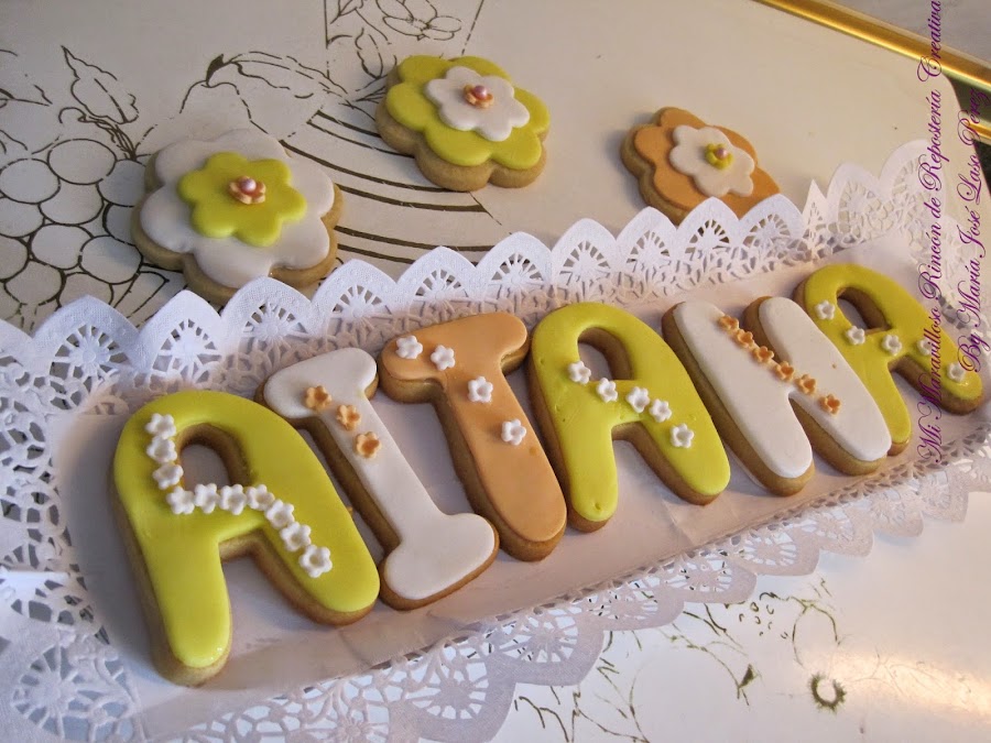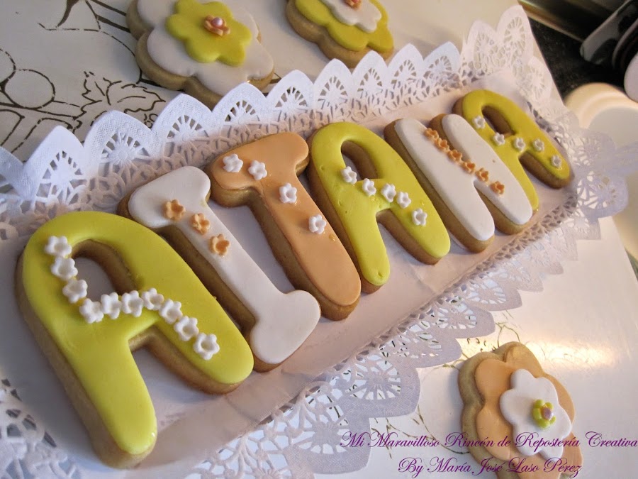Como las dos son adorables, muy aplicadas y tienen mucho talento, he intentado diseñarles las galletas para adecuarlas a sus gustos y aficiones, para que de esta manera, reflejen una pequeña muestra de su personalidad.