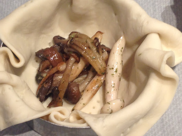 Una vez hayas pinchado el hojaldre con el tenedor, añade unas cuantas setas.