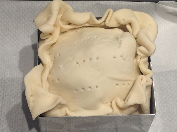 Coloca el resto de hojaldre encima del molde y presiona cuidadosamente hacia abajo, evitando que se rompa.