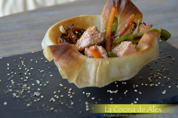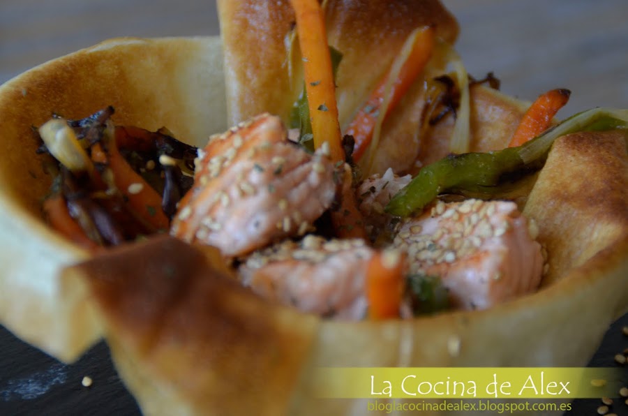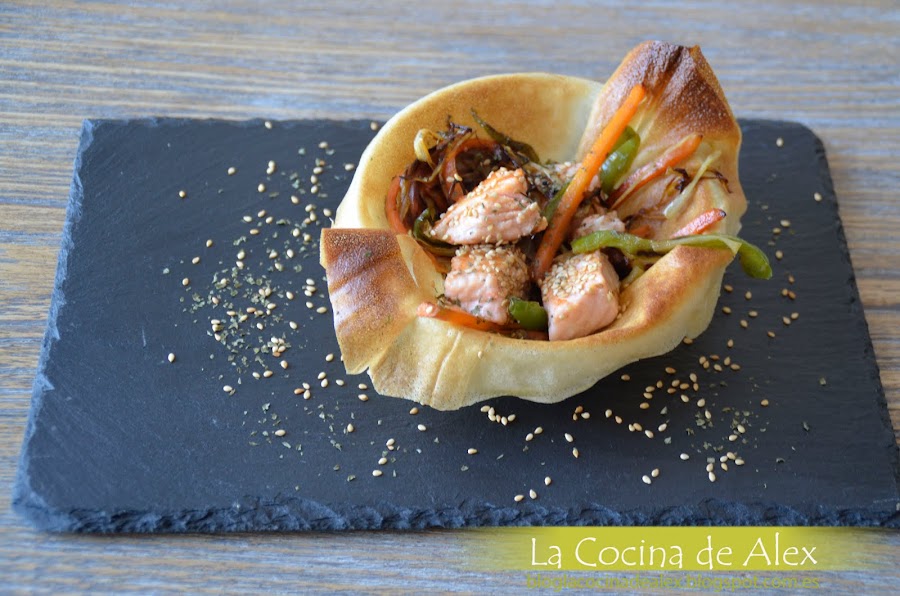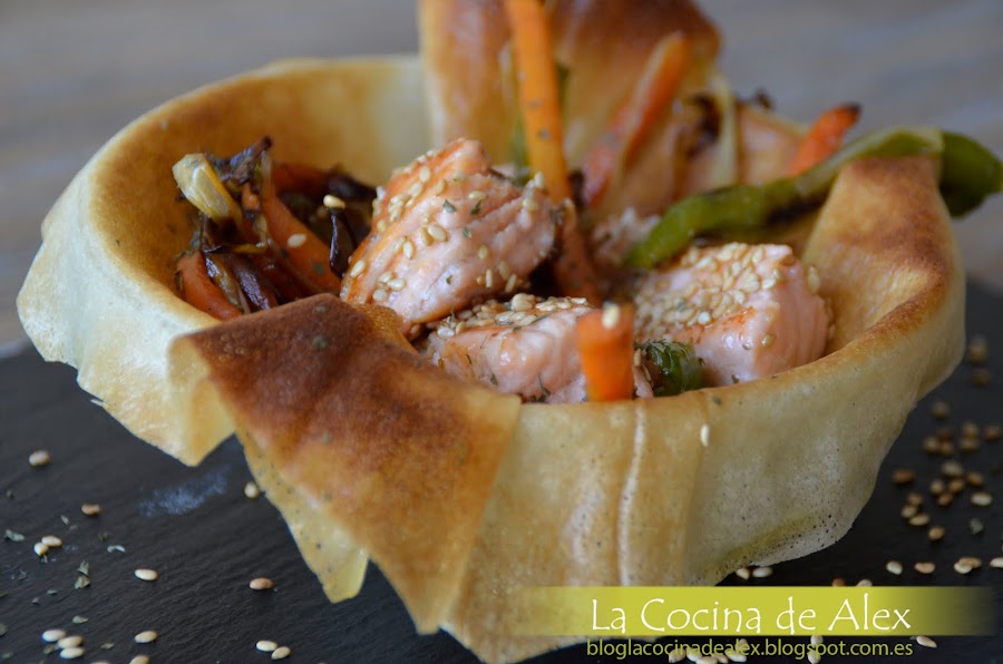 Para la presentación final ponemos en las tulipas la verdura salteada y unos tacos del salmón con el sésamo, espolvoreando con un poco de sésamo y perejil. Y a disfrutar!