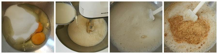 En un bol batimos los huevos con el azúcar hasta que se pongan cremosos. Añadimos la leche caliente batiendo constantemente. Dejamos enfriar y añadimos la ralladura de limón y las galletas molidas, incorporando bien.