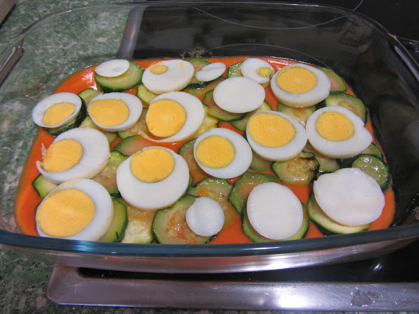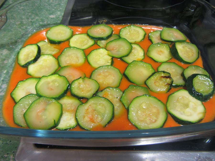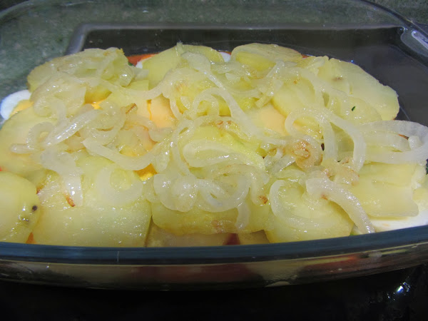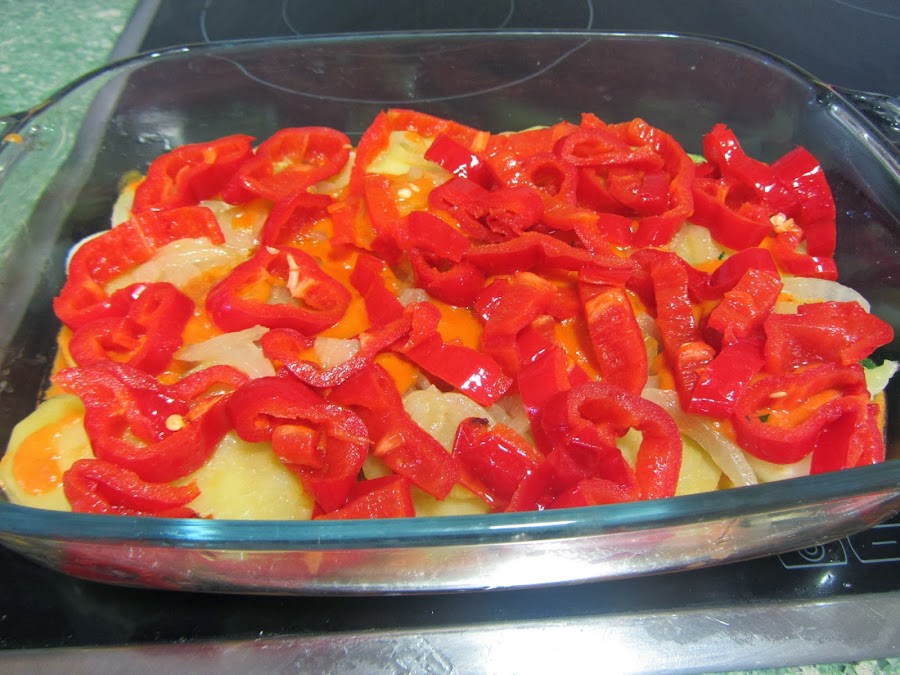 Si queremos, podemos poner salsa tomate entre las distintas capas de verduras; yo he puesto encima de la capa de patatas y cebolla.
