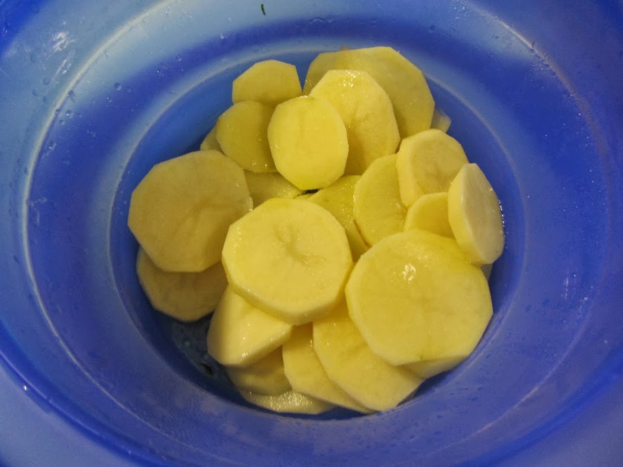 Pelamos y cortamos las patatas en rodajitas, también de 1/2 cm. aproximadamente. Y las colocamos en el recipiente apto para el microondas, añadimos también un poquito de sal y un chorro de aceite, y movemos bien.
