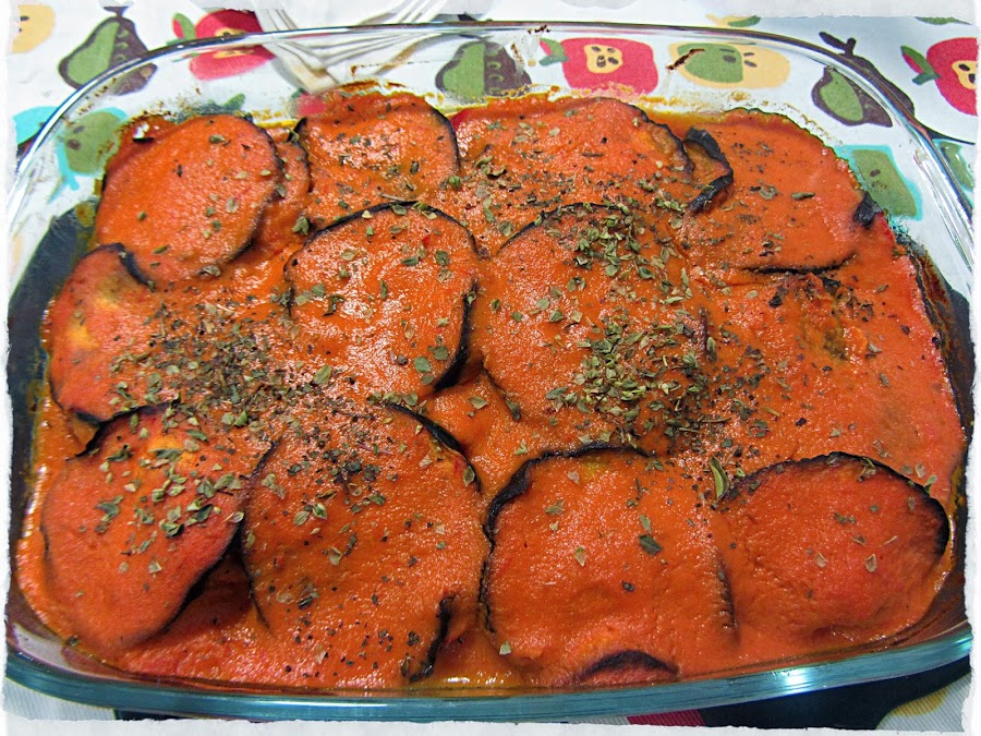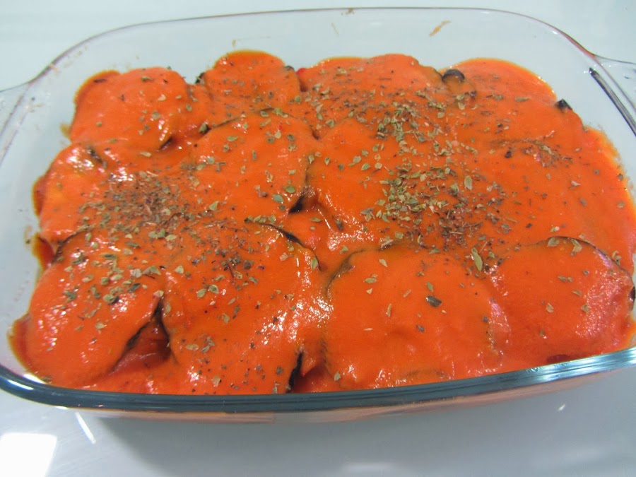 Y cubrimos con la salsa de tomate por encima, espolvoreamos con el orégano y la albahaca o mejorana, y horneamos durante 20 minutos a 190º, con calor arriba y abajo.