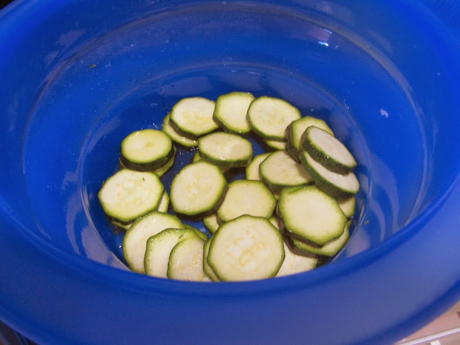 Cortamos los calabacines en rodajitas, aproximadamente del mismo grosor que las berenjenas. Los colocamos en un recipiente apto para el micro, añadimos un pellizco de sal y un chorrito de aceite, y movemos bien, para que se impregnen todas las rodajitas.