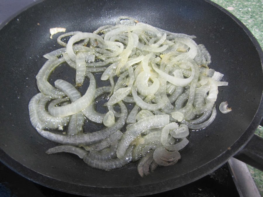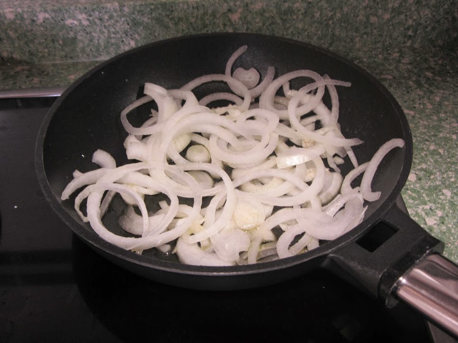 Cortamos también la cebolla en aritos finos, ponemos un chorro de aceite de oliva en una sartén, y rehogamos la cebolla a fuego medio, tapando la sartén.