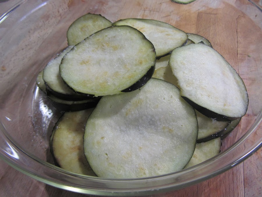 Cortamos las berenjenas en rodajas de ½ cm, y las ponemos en un recipiente, cubiertas con sal para que suelten líquido y pierdan el amargor.