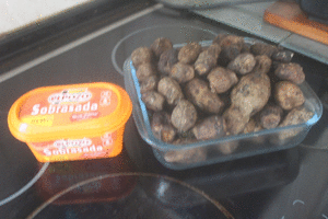 Se pueden pelar, pero yo opté por no pelarlas, se parten por la mitad y se les coloca en cada mitad una cucharadita de sobrasada, presionando esta, para que se pegue bien y cubra la superficie de la tupinamba.