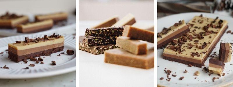 3 chocolates, capas de negro, con leche y blanco todas totalmente caseras. Esta última con nuestra receta secreta. Este es mi favorito. Contiene lácteos.