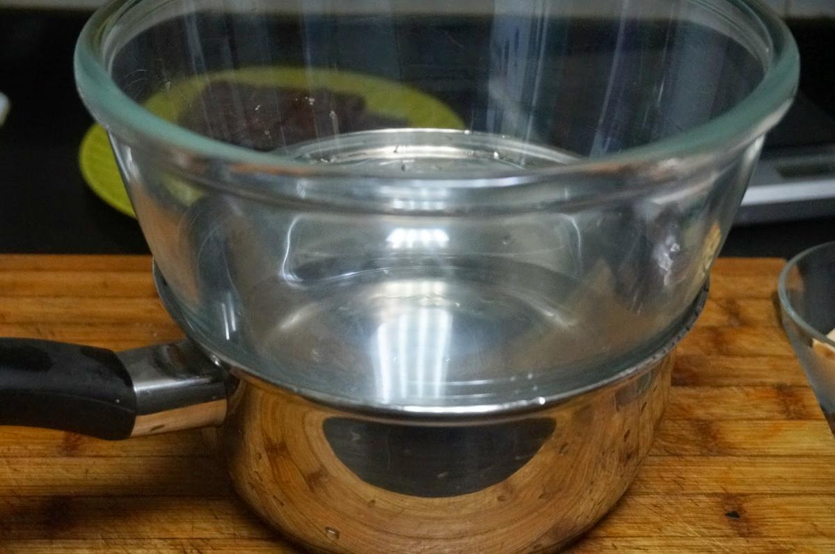 Lo iremos removiendo bien hasta que esté desecho. El agua del cazo ha de estar siempre bien caliente. Seguido echaremos el chocolate de postres en trozos.