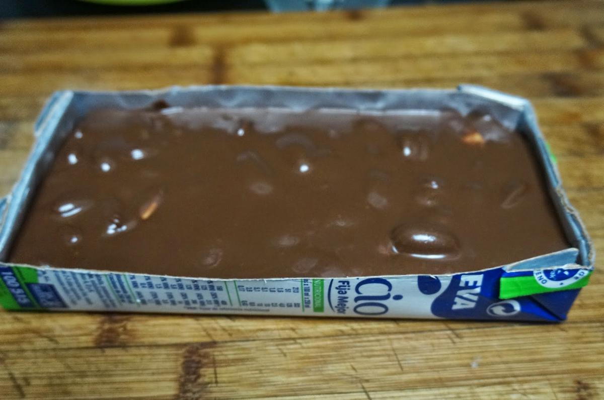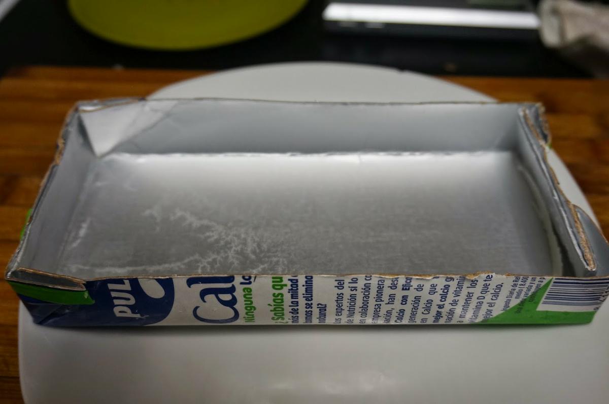Prepararemos un molde, si no tenéis y queréis que quede como una barra de turrón, podéis hacer este invento, yo lo vi en Internet y va muy bien. Solo tenéis que cortar un brik de leche por la mitad y limpiarlo bien, os servirá de molde.