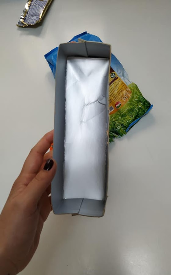 Empezamos preparando nuestros moldes para el turrón, con un brik de bebida vegetal, lo cortamos por la mitad, como en la foto.