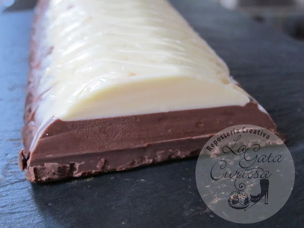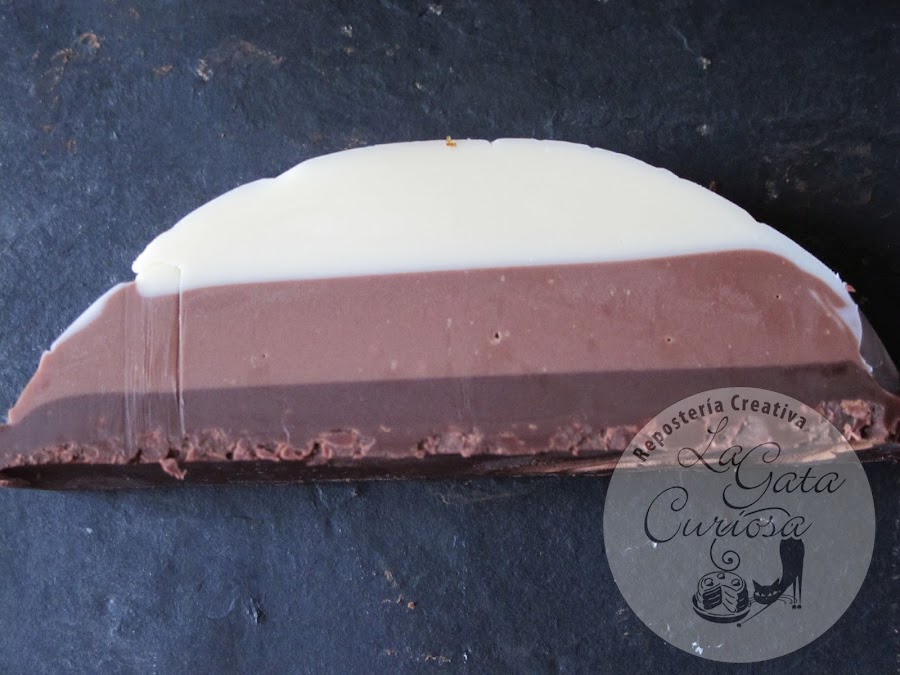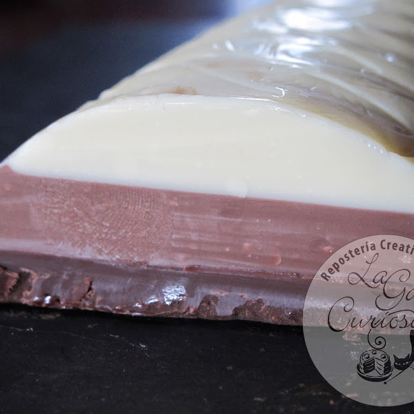 Poner una olla con agua al fuego, en un cazo poner el 2/3 del chocolate blanco y una tercera parte de la manteca de cerdo, cuando el chocolate esté fundido y esté bien mezclado con la manteca sacamos del fuego y ponemos el resto del chocolate que habíamos reservado, volvemos a mover hasta que esté bien fundido, pasamos al molde, alisamos la superficie y dejamos enfriar en el congelador. Procedemos de la misma forma con el chocolate con leche, sacamos el molde del congelador y ponemos la capa de chocolate con leche, alisamos y volvemos a poner al congelador. Por último procedemos igual con el chocolate negro, una vez fundido lo pasamos al molde para hacer la última capa, dejamos en la nevera como mínimo una noche antes de cortar. Para cortar mejor sacar unos minutos antes de la nevera, conservar en frío.