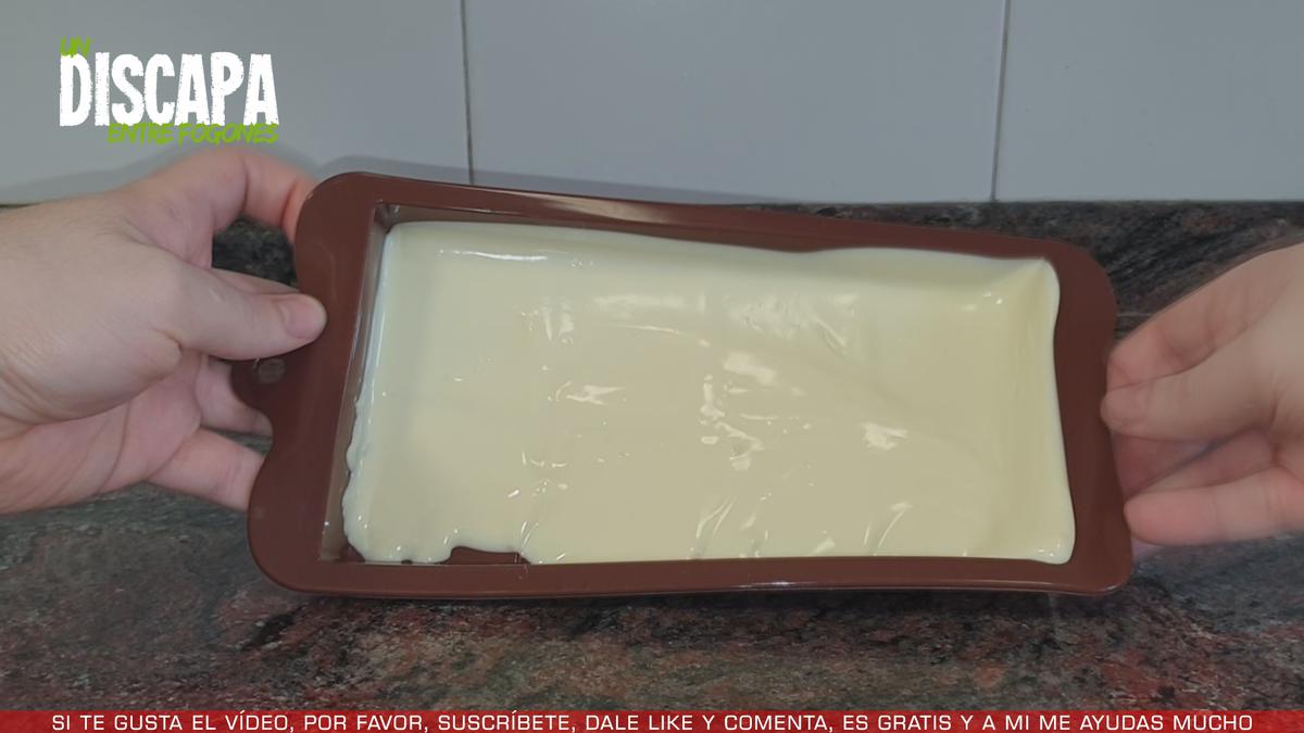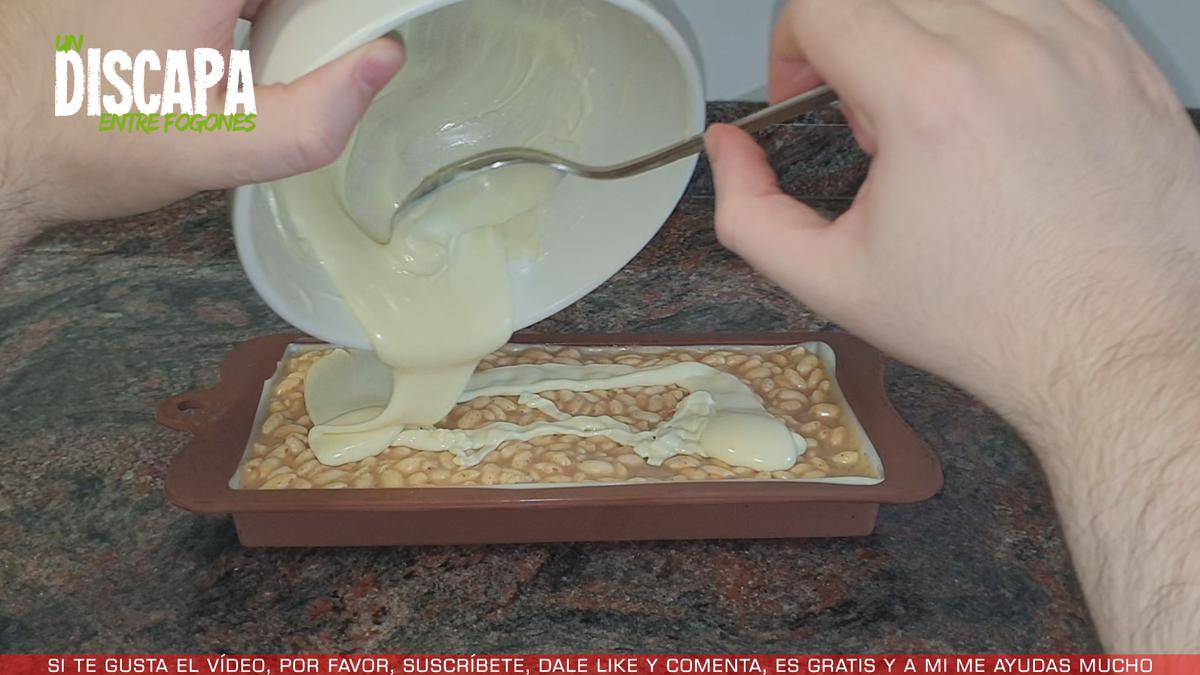 Y una vez derretido añadimos la mitad del chocolate al molde donde haremos el turrón.