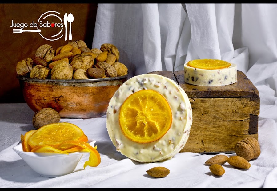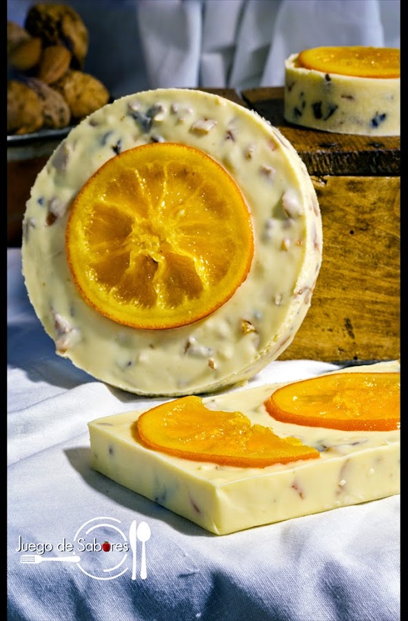 Esta enorme rodaja de naranja no es un homenaje al sol, aunque en invierno no estaría de más contentar al astro rey para que nos caliente un poco más si cabe. Es una naranja confitada que hemos añadido a este turrón de chocolate blanco con frutos secos. Este turrón escapa a los clásicos de toda la vida, los de alicante, yema quemada y jijona. En años anteriores ya habíamos hecho un turrón de conguitos y krispis y otro de chocolate con naranja confitada que gustaron mucho. Ahora tocaba cambiar. Dejamos el chocolate negro y nos pasamos al blanco. No por nada, sólo por contentar al sector de la familia que prefiere este tipo de chocolate, y que espera golosamente la hora de los postres navideños a pesar de haberse metido antes entre pecho y espalda los aperitivos, el primer plato y un segundo plato contundente. No sé cómo se las arreglan pero siempre les cabe en el estómago un poco más de lo que sea. ¡Ya llegará la época del régimen, del "no me entra esta falda" y "estos pantalones ya no dan más de sí"!