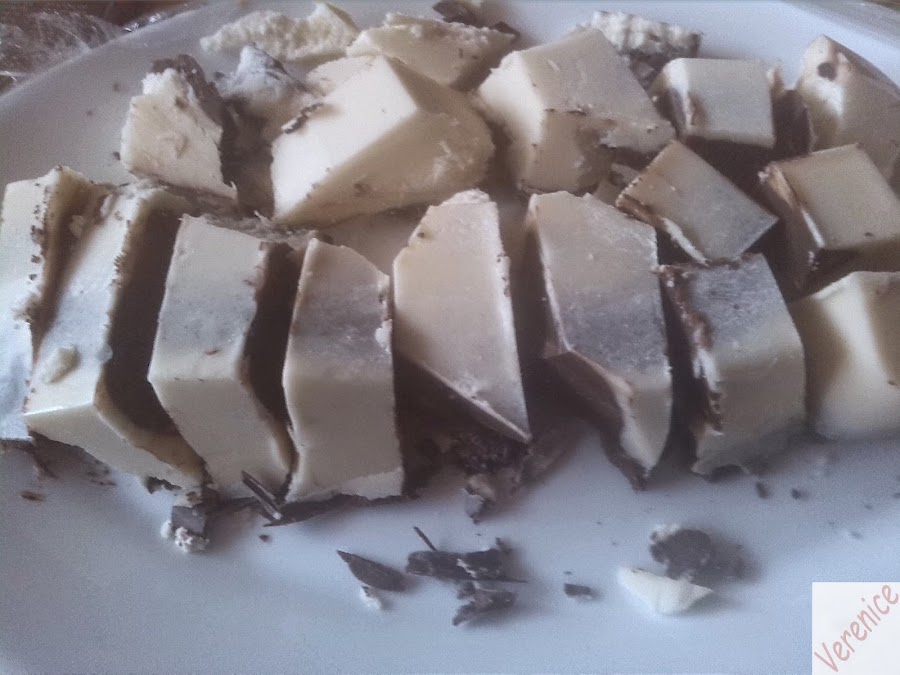 Se vuelca sobre el molde que tenemos el chocolate blanco, y como estará aún blando, se subirá y quedarán los dibujos del marmolado, no hace falta remover