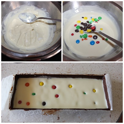 Cuando haya endurecido, ponemos en un recipiente al baño maría el chocolate blanco y los 30g de manteca de cerdo. Retiramos del fuego y añadimos los M&M.