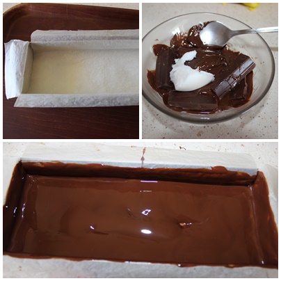 Echamos el chocolate en el molde del turrón y lo repartimos por el fondo y los lados, nos ayudamos de una brocha de cocina. Dejamos enfriar durante 1 hora en el frigorífico hasta que endurezca.