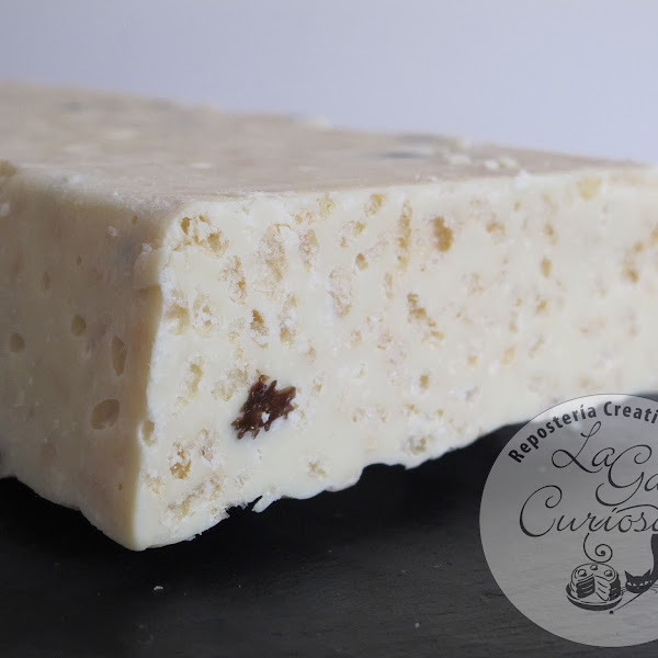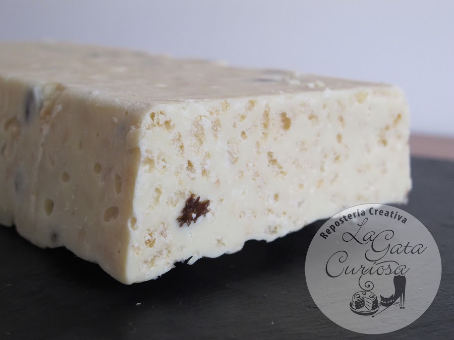 Después de hacer el turrón de chocolate tipo Suchard me acorde de que a mi hijo el chocolate que más le gusta es el blanco así que me dispuse a hacer otro turrón pero con este chocolate, como no quería que fuese igual que el otro le he añadido unas pasas y unas cucharadas de Drambuie (licor de whisky), el resultado por lo que he podido observar debe ser muy bueno porque literalmente vuela, lo veo disminuir rápidamente y eso que en casa solo lo comen dos personas.