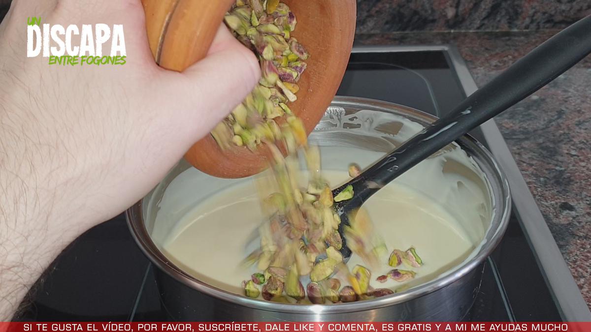 3Cuando ya tenemos el chocolate derretido, añadimos los pistachos troceados y mezclamos bien.