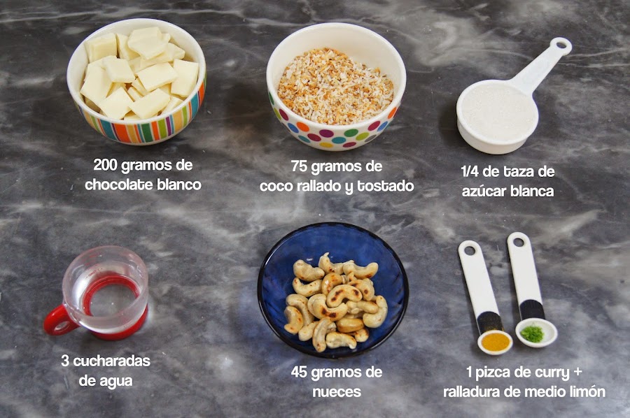 Este mes le tocó al blog "Postres originales" ser asaltado. Elegí este turrón de chocolate blanco, coco y curry (pueden encontrar la receta original aquí) ya que se veía delicioso y nunca se me había ocurrido juntar chocolate blanco, curry y coco. Decidí agregarle un ingrediente: praliné de nueces (en este caso cashews) y queda delicioso ya que le da un toque más crocante. Pueden dejar al turrón endurecer en moldes de silicona, de bombones o en una lata con papel manteca. Yo los decoré con un poco de chocolate bitter.
