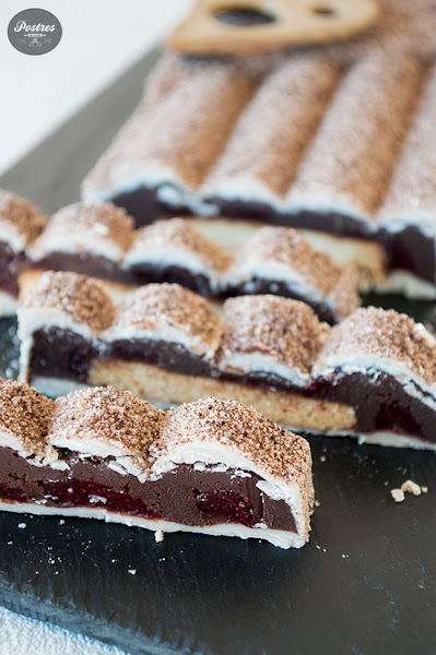 Metemos la ganache en una manga y rellenamos el molde hasta un poco menos de la mitad. Ahora ponemos tres tiras de gel de frambuesa y cubrimos con mas ganache, finalmente ponemos el sable y presionamos ligeramente (aquí lo ideal es que el sable sea finito para que nos quepa bien, a mí me quedo un poco gordito y tuve que presionarlo bastante para que me cupiera en el molde y eso hizo que la frambuesa se me fuera para los lados, así que cuanto más finito sea el sable mejor os quedara). Terminamos de rellenar los bordes con mas ganache, alisamos bien procurando dejar espacio para poder cerrar después con la cobertura exterior.
