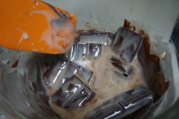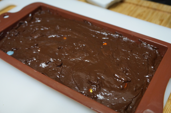 Añadimos los Lacasitos en la mezcla de chocolate. Removemos y mezclamos.