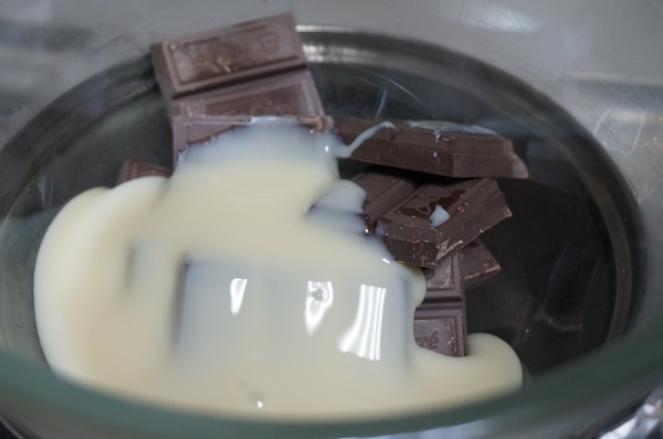 Cogemos un cazo y ponemos un poco de agua un ( como un par de dedos). Cuando empiece a hervir bajamos a fuego medio, ponemos encima un bol con el chocolate `picado y la leche condensada.