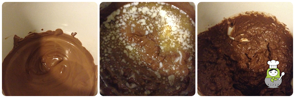 Ahora que tenemos todos los ingredientes listos, ponemos un cazo a calentar al baño maría. En el colocamos los chocolates troceados (si encontráis el chocolate con leche para postre, perfecto. Es una verdad universal que cuanto mejor sea el chocolate, más bueno estará el turrón). Revolvemos bien hasta que se mezclen perfectamente.