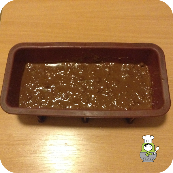 Vertemos la masa en un molde para turrón (si no tenéis uno, como es mi caso, podéis usar un molde para bizcocho o un táper, lo importante es que tenga forma rectangular). Nivelamos bien el chocolate dentro del molde con ayuda de una espátula para que quede liso y repartido uniformemente y cuando lo tengamos movemos un poco el molde para que todo el chocolate baje y no queden huecos.