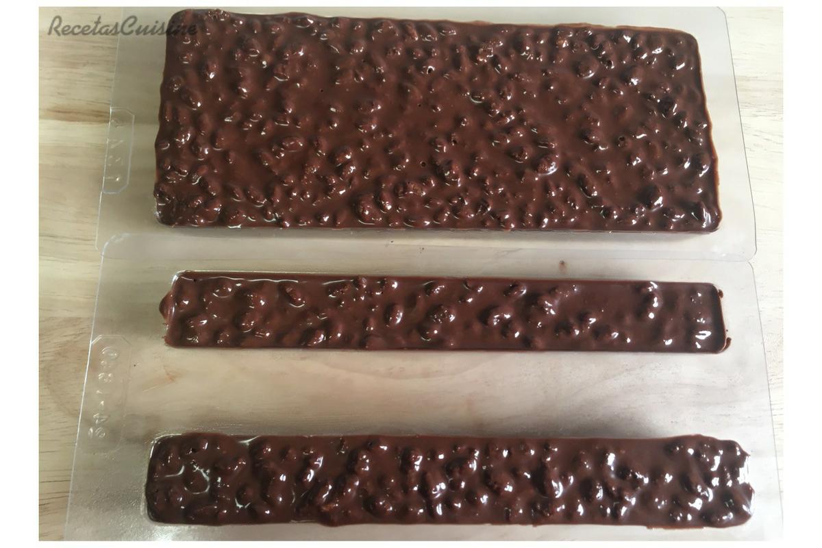 4. Vertemos la mezcla en un molde para turrón, yo lo he puesto en un molde de plástico duro de tableta que mide 20x8cm, y me ha dado para rellenar otro molde en forma de barrita (salen dos) como os muestro en la foto. También hay moldes de madera o de silicona para turrón. Si no tenemos molde específico para este tipo de elaboración, podemos usar uno tipo plum cake, o improvisar uno cortando un brik de leche o zumo por la mitad longitudinalmente, para que nos quede con la forma de una tableta.