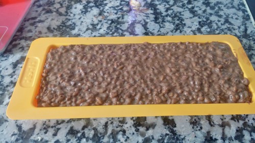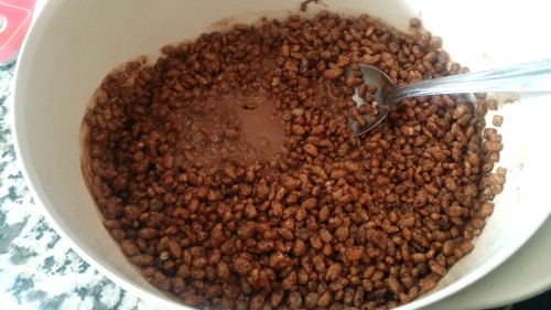 Una vez se haya fundido el chocolate lo volcaremos sobre el arroz inflado y mezclamos bien.