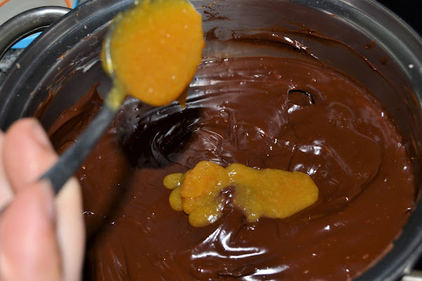 Añadimos el licor, la mantequilla a temperatura ambiente y la mitad de la naranja confitada, para que cojar el chocolate ese delicioso sabor, reservamos la otra mitad y mezclamos bien.